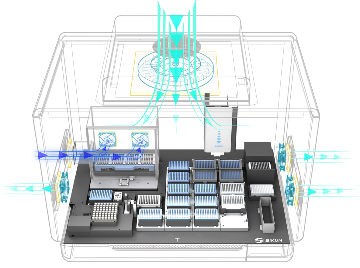 用于保障样本安全,配备高效过滤器及紫外消毒体系,同时设置防污染风道,实现全链路防污